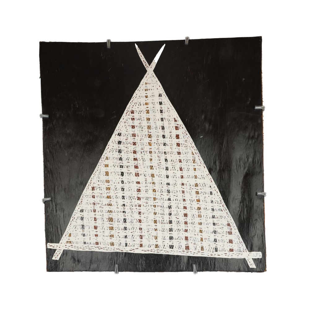 The grid refers to the landscape of Waṉḏawuy – a network of billabongs surrounded by ridges and high banks. Its structure also having reference at one level to woven fish traps. Ancestral Hunters who set a trap here to snare the Shark but to no avail. These Yolŋu are called Bärngbarng and Monu’a who came to cut the trees named Gu’uwu, Gathurrmakarr, Nyenyi, Rulwirrika and Gananyarra – all Dhuwa trees. They used straight young trees. And cut them with their axes called Gayma’arri, Bitjutju.