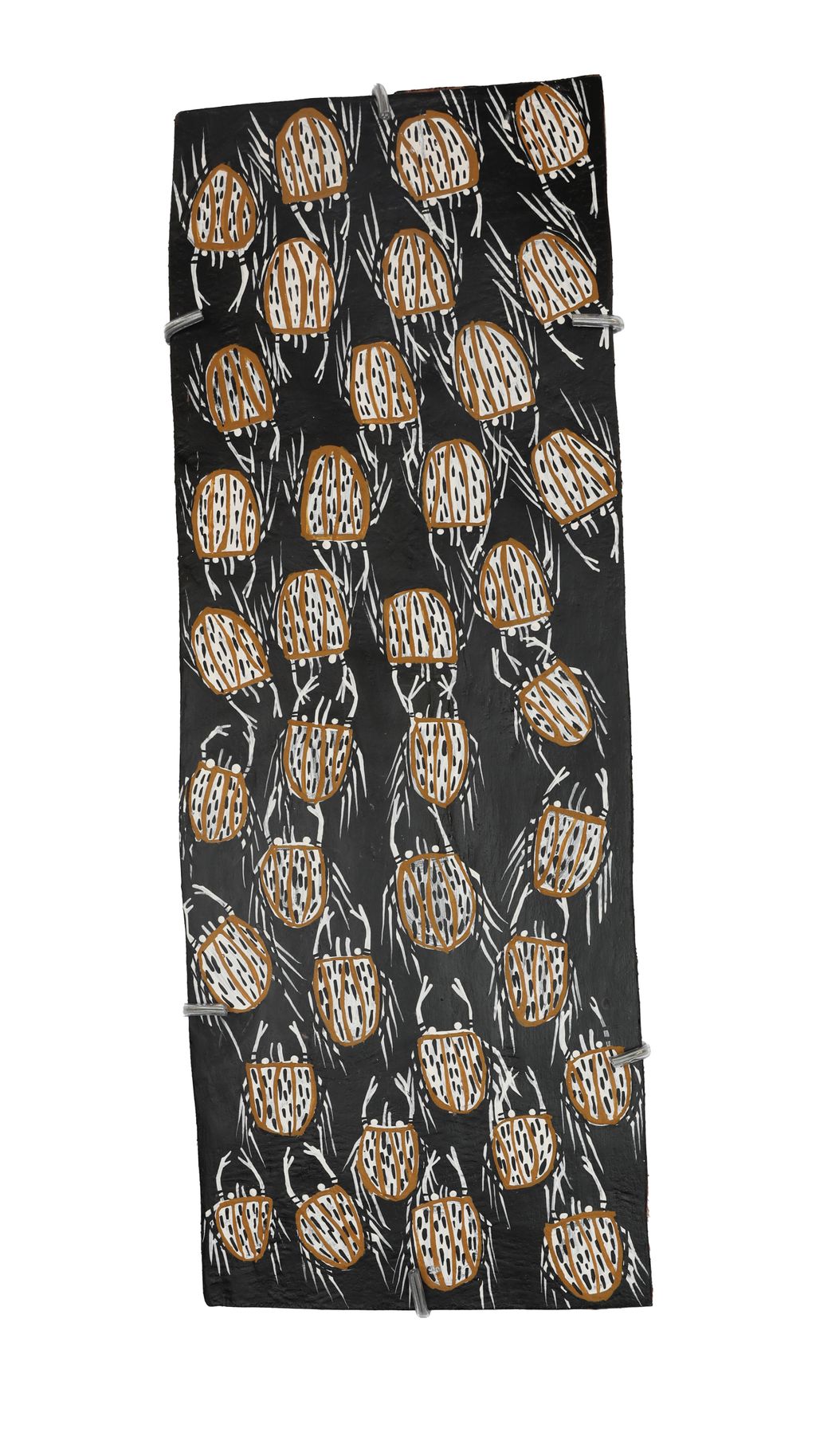The Yiŋapuŋapu is a low relief sand sculpture designed to keep any contamination of death at bay as traditionally the body of the deceased was placed within it for initial mortuary rites, to cleanse the bones of dangerous spirits held within the body tissue. A metaphor for this action of cleansing is utilised by the Maŋgalili in their sacred paintings by way of depicting Mirriya or Gunyan the sand or ghost crab picking the bones of a fish carcass on the beach. Contemporary Maŋgalili on the beaches of Djarrakpi put their food scraps in one place when at camp – the secular Yiŋupuŋapu. This painting shows the totemic Mirriya which feeds on the Ancestral remains of the parrot fish Yambirrku. The miny’tji or sacred clan design for the sandscapes of Djarrakpi both adorn and surround the crabs. In traditional mortuary ceremony for this clan the last act is to catch and eat Yambirrku and dispose of the bones in the ceremonial sand sculpture for the crabs to pick clean overnight.