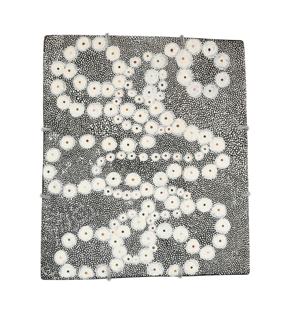 The star shapes in this design are the Yathiny, an anenome like colony of single cell organisms which presents as a disc up to 5cm across with fine blue hairlike scillae. This is the food of turtles and a Dhuwa icon. Since 2007 Djalinda has distinguished herself as an innovator with the mixing of traditional pigments to create new tones such as pink and green.