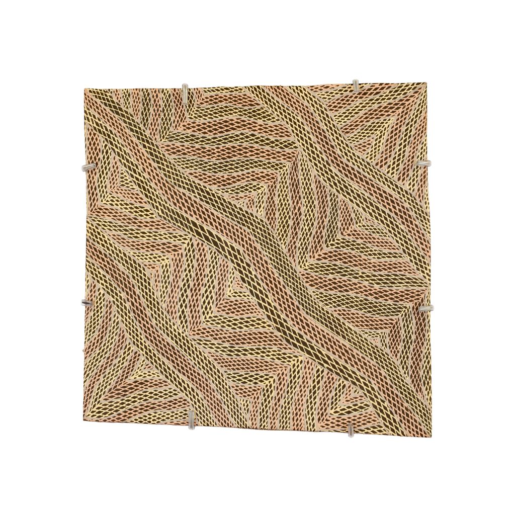 The miny’tji (sacred clan design) on this piece identifies the Dhalwaŋu saltwater estate of Garrapara on Blue Mud Bay. Here is the sacred site for the Dhalwaŋu Yiŋapuŋapu, a mortuary based sand sculpture used for the initial rites of the dead. The deceased placed within the Yiŋapuŋapu’s elliptical confines has its own contamination kept at bay.