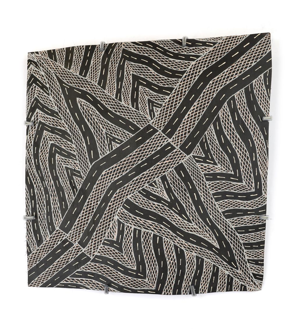 Garrapara has been rendered by the wavy design for Yirritja saltwater in Blue Mud Bay called Mungurru. The Mungurru is deep water that has many states and connects with the sacred waters coming from the land estates by currents and tidal action. This sacred design shows the water of Djalma Bay chopped up by the blustery South Easterlies of the early Dry season.
