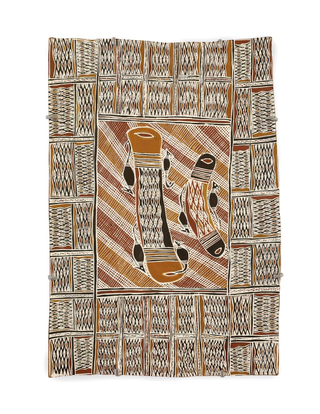 The Gumatj clan design associated with these events, a diamond design, represents fire; the red flames, the white smoke and ash, the black charcoal and the yellow dust. Also the black skin, yellow fat, white bone and red blood of Gumatj people. Clans owning connected parts of this sequence of ancestral events share variations of this diamond design.