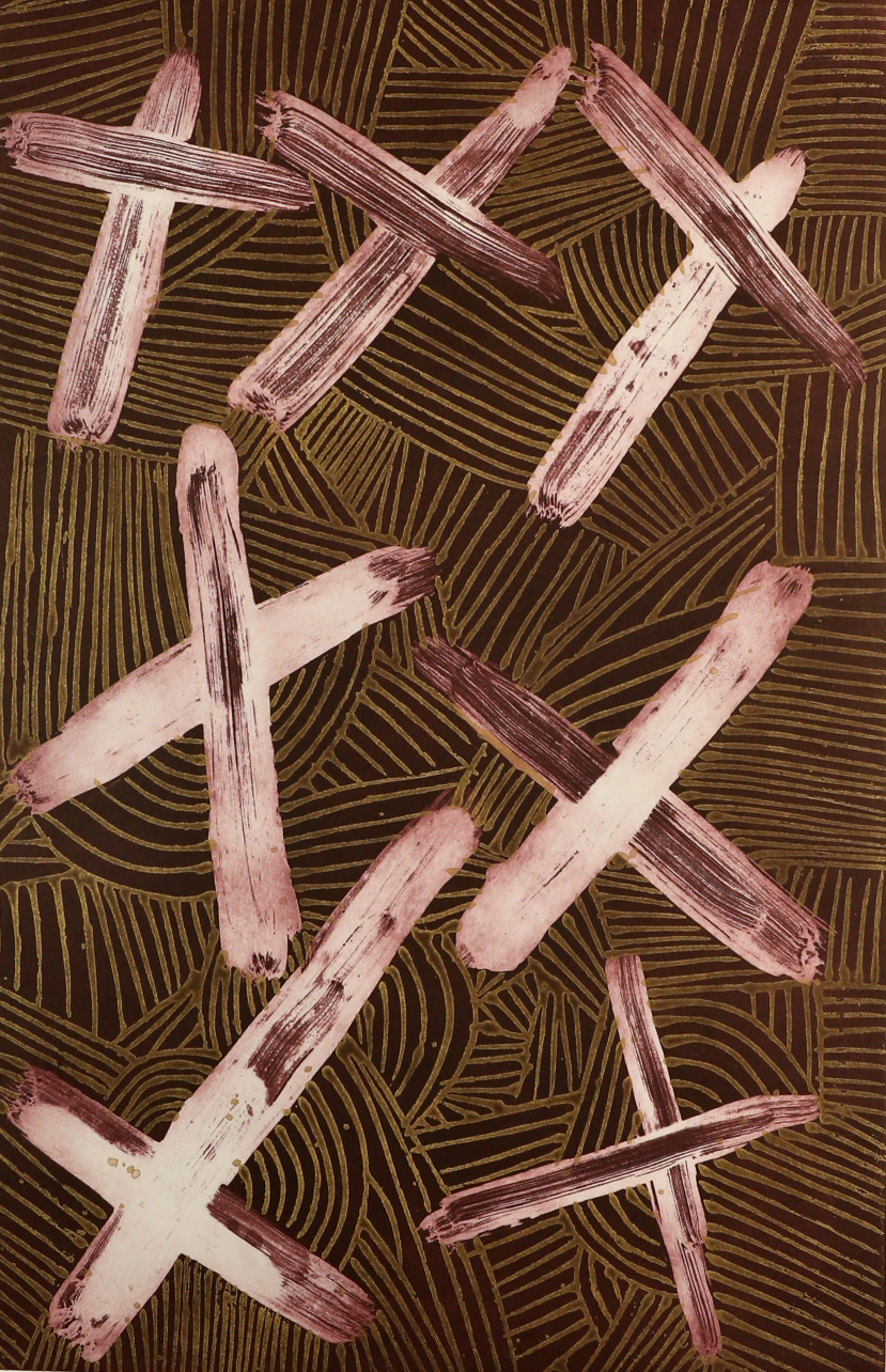 This print is a reflection of how I see the stars in the night sky. To me, they come in all different sizes and colours and they cross all over the night sky. When I look up at the stars it makes me happy & proud. The stars are like our ancestors – they keep us connected always. The stars are a part of my miny’tji. It is the same story as my barks.