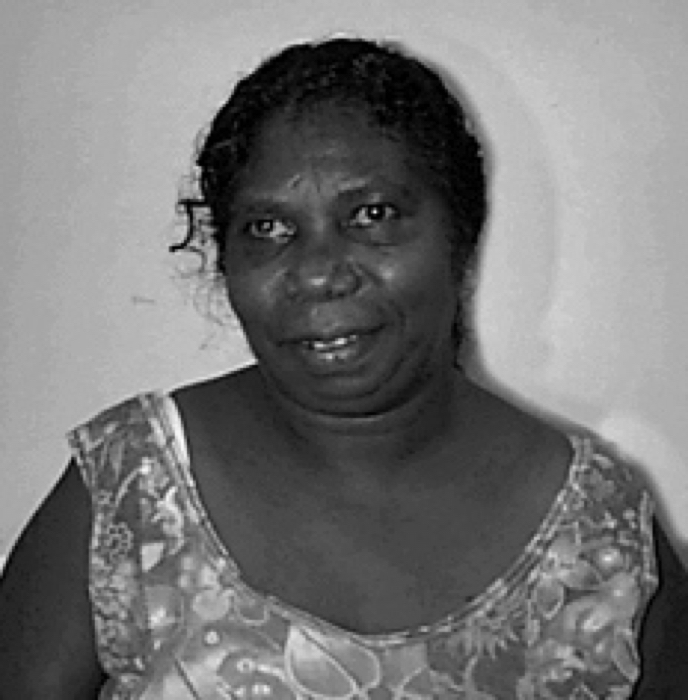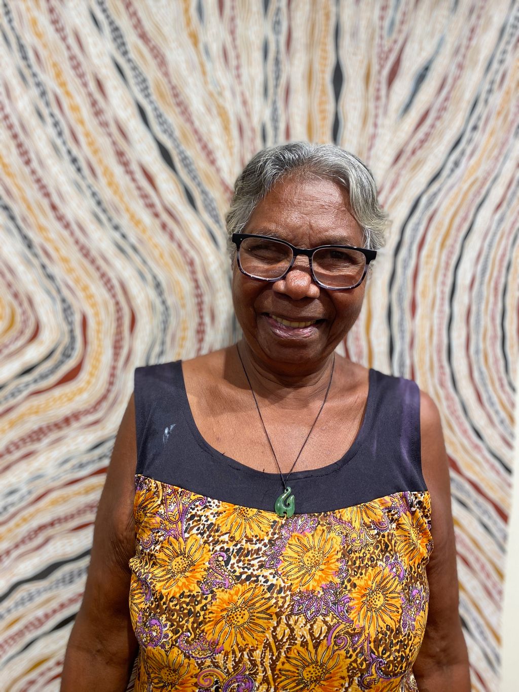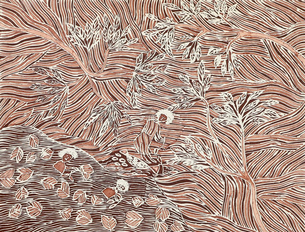 “Two miyalk (women) collecting ŋatha (food) – They are diving down for the Waterlily Wakwak . We eat the yellow seed inside the fruit, the tuber which connects to the roots (ṉiṉḏaṉ’/burpa/ḏirrpu) inside the mud, the stem which can be eaten raw and some parts of the young flower buds. We get these wakwak (waterlilies) from the billabong, Waŋurru near my homeland at Bäniyala. The one miyalk waiting for the others in the shade has a basket called wutjumuŋu which has the ŋatha her friends have collected and thrown to her in it.