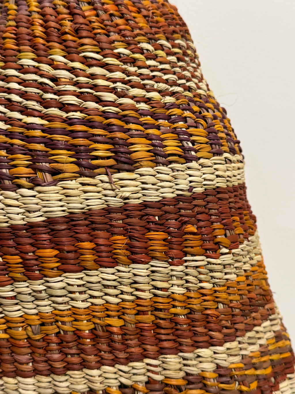 The conical woven basket is a sacred form which has ceremonial metaphoric meaning. It is also the age old form which Yolŋu have always used as a receptacle for important possessions and gathered food. These baskets can be so closely woven that they can even contain liquids if sealed with beeswax. In ceremony such Bol’pu as they are known can be adorned with feathers and take on a sacred character. There are feminine references in this form.