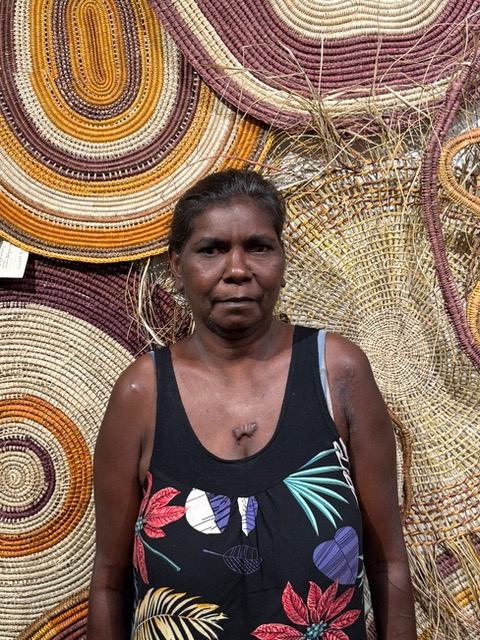The age old practice of weaving mats from the leaves of pandanus continues today. Making these things is very labour intensive. Gathering the materials can be quite exhausting. The spiky pandanus leaves are sometimes difficult to harvest, followed by the careful task of flaying the leaves before hanging them to dry. Only the few central leaves of the palm growing from the core which have not bent are used. these can be ten or twenty feet high so a special crook known as a Galpuŋaniny must be used to work these out of the growing tree. The pandanus (known as Gunga- Pandanus Yirrkalaensis) recovers completely but cannot be reharvested for some months. The dyes used are from the bulbs, roots or bark of various woodland plants. Each of these plants only grow in different specific locations. Once the material is collected, trimmed, dried and dyed the weaving begins. This is almost always done by women in groups. Men have been known to weave ceremonial or sacred objects but these are not for sale. Some of the plants used for dyeing are; Yiriŋaniny which is a small grass like plant with a red bulb under the ground, Burukpili (Cheesefruit/Noni) whose root gives a yellow dye. These and others are used with various catalysts like the ash from particular plants to create endless variations of colour. It is said that the practice of dyeing rather than painting fibrework with ochres is a practice that spread form the West but no time is specified.