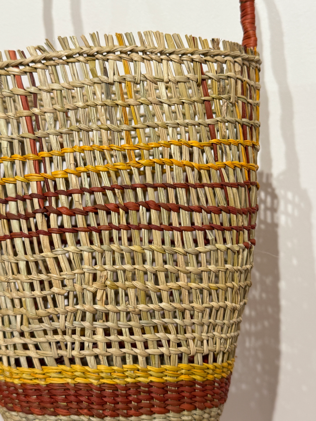 The conical woven basket is a sacred form which has ceremonial metaphoric meaning. It is also the age old form which Yolŋu have always used as a receptacle for important possessions and gathered food. These baskets can be so closely woven that they can even contain liquids if sealed with beeswax. In ceremony such Bol’pu as they are known can be adorned with feathers and take on a sacred character. There are feminine references in this form.