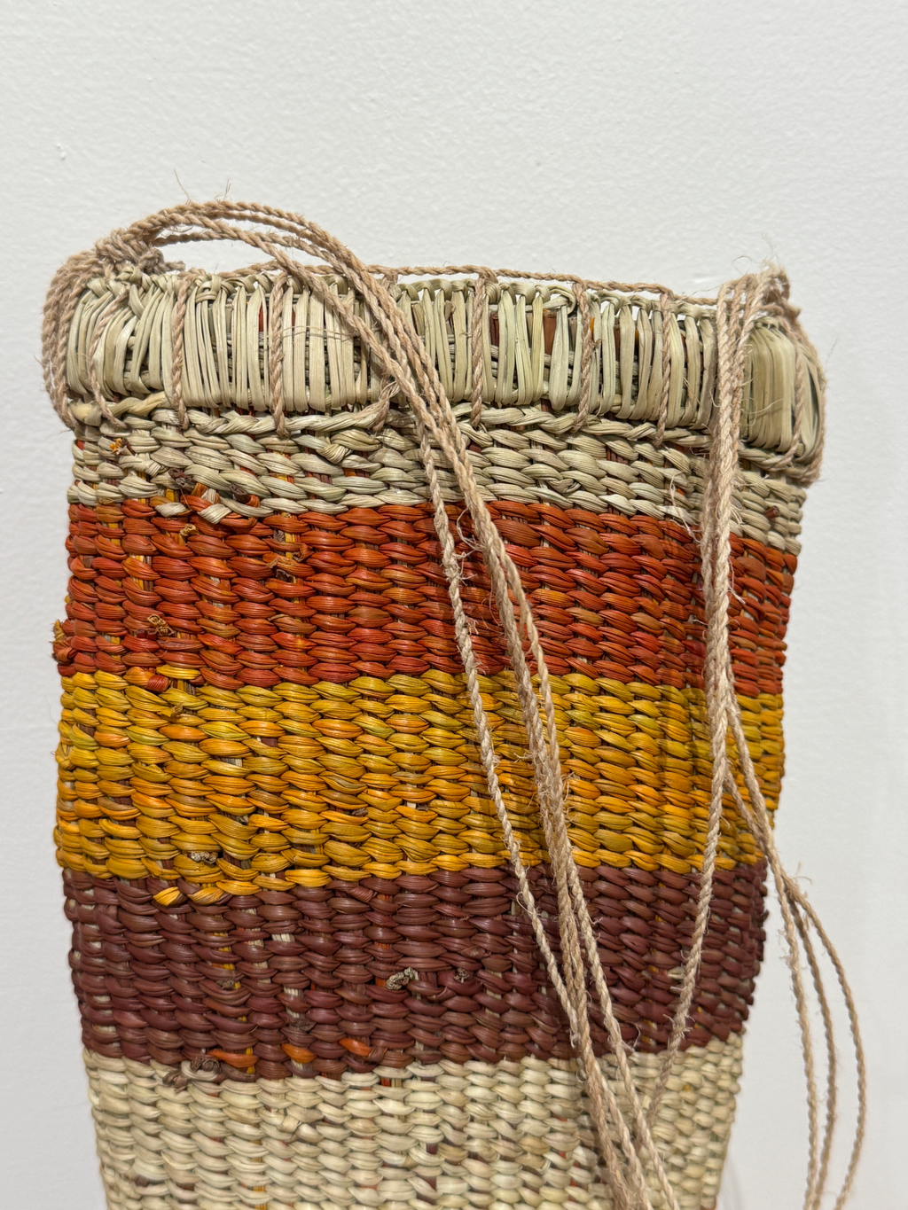 The conical woven basket is a sacred form which has ceremonial metaphoric meaning. It is also the age old form which Yolŋu have always used as a receptacle for important possessions and gathered food. These baskets can be so closely woven that they can even contain liquids if sealed with beeswax. In ceremony such Bol’pu as they are known can be adorned with feathers and take on a sacred character. There are feminine references in this form.