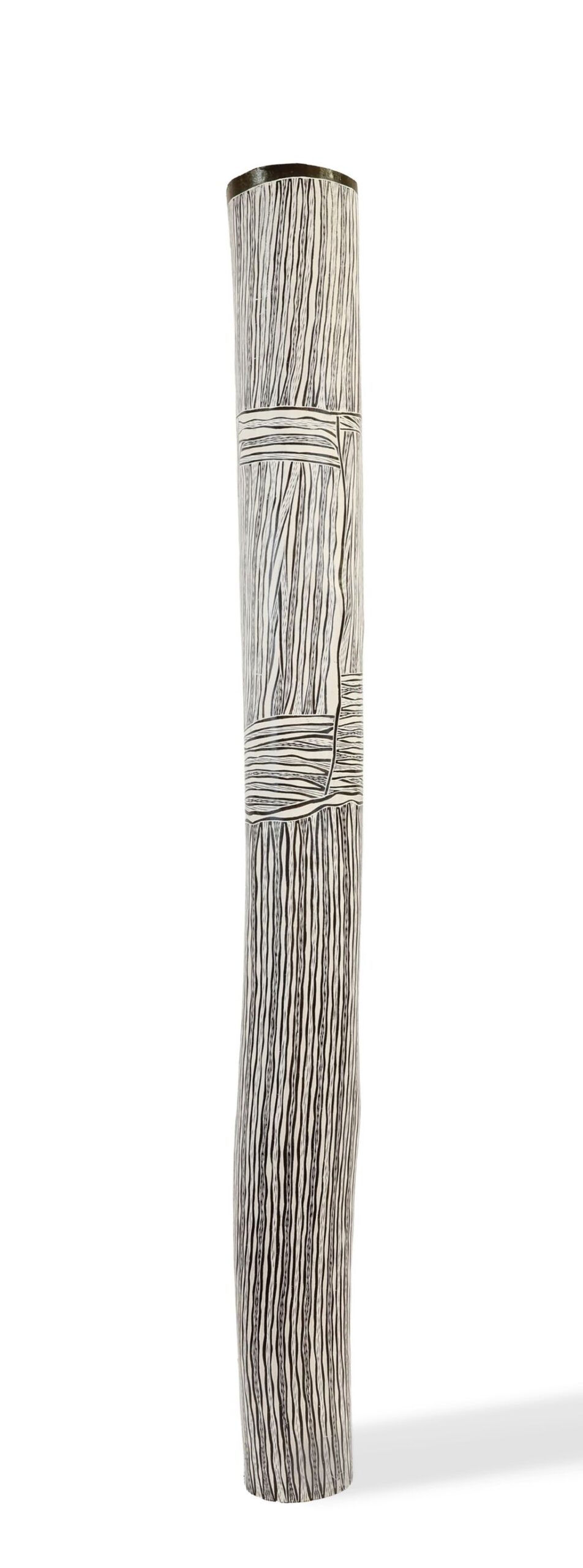 After sitting under a tree and preparing rope, ancestral hunters Burrak and Garramatji went out hunting at Yathikpa in their canoe for dugong. The dugong fled to the dangerous waters around Marrtjala, the hunters harpoon striking the rock causing the Ancestral Fires to flare and boil the waters. This lead to the canoe capsizing and drowning to occur. The hunter’s paraphenalia includes their harpoon which still floats with the tides between various clan estates including the Madarrpa’s Yathikpa. This sacred object is known as Dhakandjali. The name specific to a memorial pole for this group is Dhakandjali.