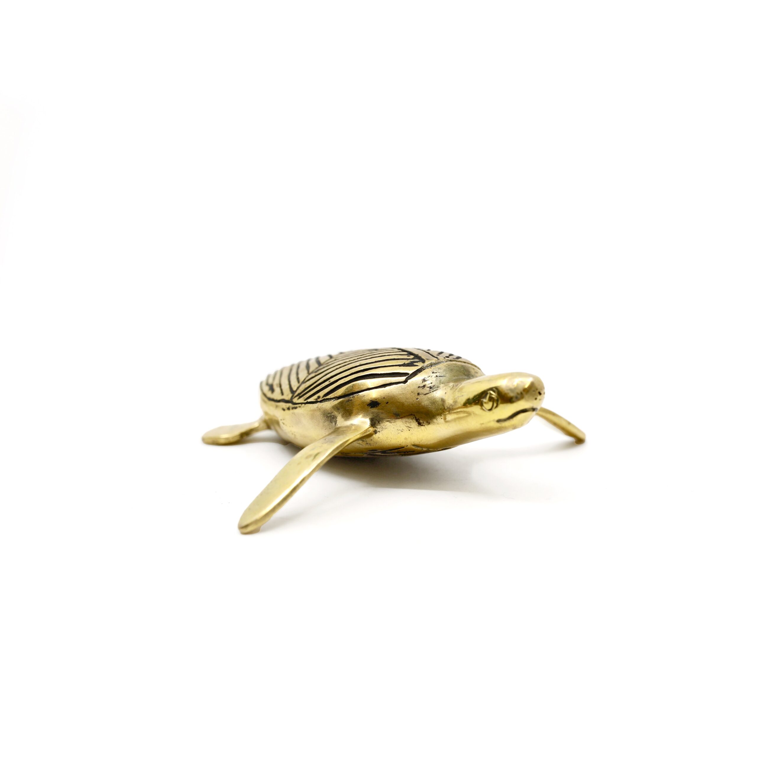 Djul’djul is the daughter of the famous Gälpu clan artist Mithinarri Gurruwiwi. She is a very precise and knowledgeable wood carver and painter. This is one of a series of three brass figurines she has created that are based upon her small wooden sculptures. This is Miyapunu – the sea turtle. There are numerous species that nest in the region, Green, Hawksbill, Olive Ridley and Flatback. Every year in the Dry Season turtles come to the raŋi (beach) to lay their eggs. Its a very important season for Yolŋu.