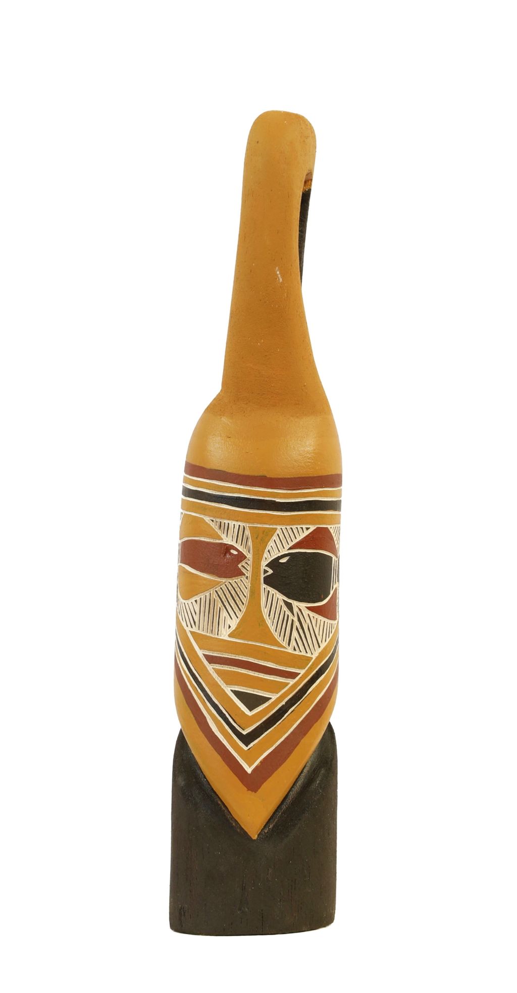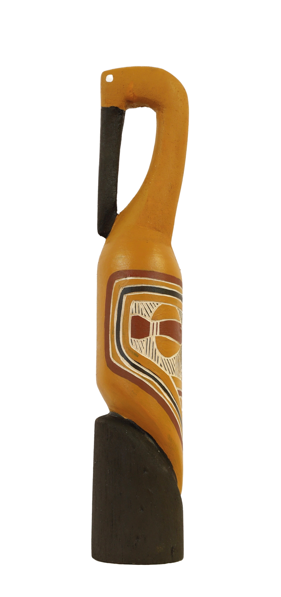 The wood is skinned and left to dry for a short period. It is then shaped by knife or axe. After the surface is sanded smooth a layer of red paint is usually the first to go down. The paints used are earth pigments. The red (meku), yellow (Gaŋgul) and black (gurrŋan) are provided by rubbing rocks of these colours against a grinding stone and then adding water and PVA glue in small quantities. Traditionally a plant resin would have been used as a fixative instead. A new batch of paint is prepared or renewed every few minutes as it dries or is used up.